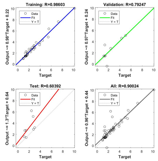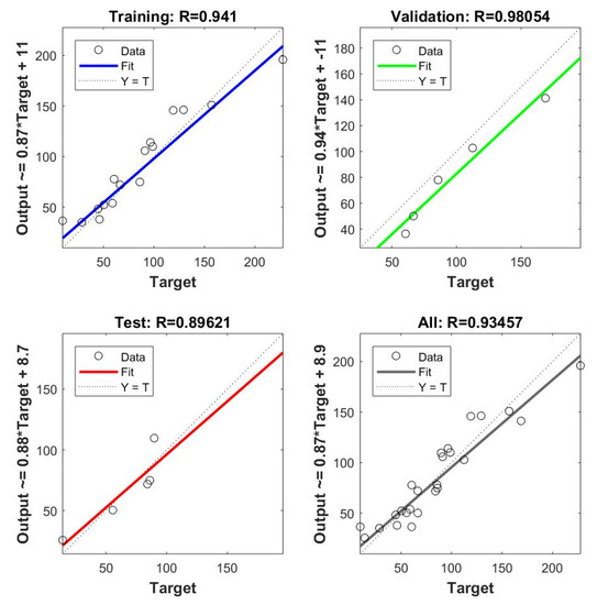 Figure 19), the relationship between the predicted and measured output can be used to verify if the models are a suitable representation of the experimental data. Each image is divided into four, which are related to the training, validation, testing, and all data combined. Every subplot contains the distributed data points, a dashed line that demonstrates the perfect fit (R = 1) between output and targets, and a solid line that represents the actual fit.