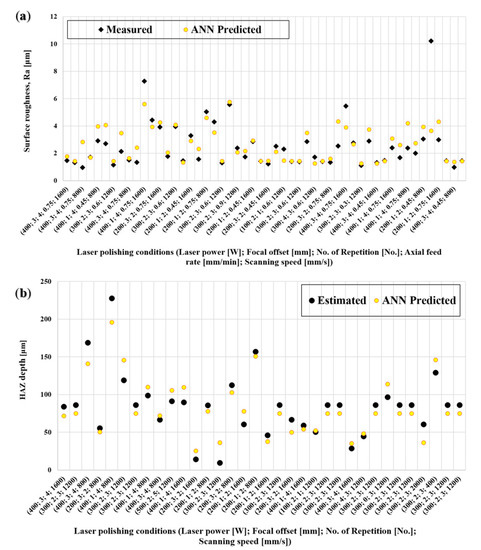 To better illustrate the performance of the ANN model, the predicted values of Ra and HAZ depth are shown in