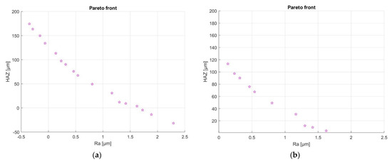 Figure 21a exhibits the Pareto front for the two competing objectives described in our work. However, not all solutions deliver realistic values for surface roughness and HAZ depth. The suitable solutions are displayed in