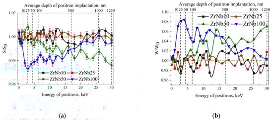 Figure 11 shows the dependence of the relative parameters S/S0 and W/W0 on the positron energy for Zr/Nb NMCs after irradiation, where S0 and W0 are parameters before irradiation, and S and W are parameters after irradiation.