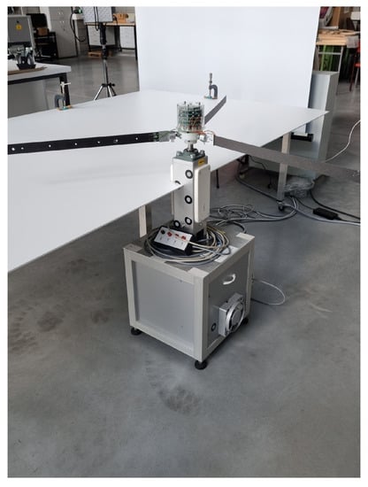 The signals from the strain gauges are sent to computer software by the wireless module. The radius of the rigid body hub is 120 mm. In the hub, there are boards with electronic circuits with the wireless module, which allows us to transmit signals from the beams. The laboratory set-up is excited by a DC motor with power of kW ( HP), and the motor is combined with the hub by a helical clutch. Between the hub and the motor, a set of nine slip rings is applied—the rings allow us to transmit measuring and control signals. The test stand was designed for scientific research and experiments with constant velocity or excitation of any optional signal, as well as excitation with different frequencies. In the authors’ previous paper [21], the experimental tests of the rotor excited by different frequencies, as well as the resonance curvature, are presented.