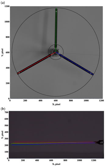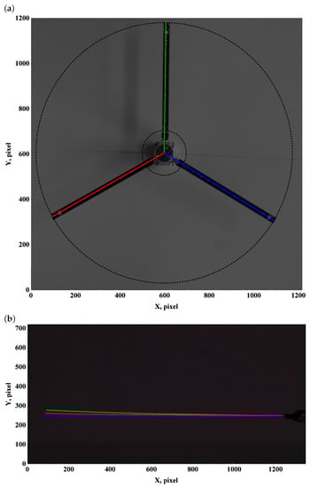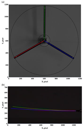 We introduce colors green, red, and blue to construct lines for beams A, B, and C, respectively. Considering the top view frames, straight lines originate from the hub axis = (,) and reflect the longitudinal axis of the undeformed beam. Line segments are described by origin and tip points defined at a distance from the origin and angle from the reference direction (horizontal edge of the photo, positively defined right direction) , where .