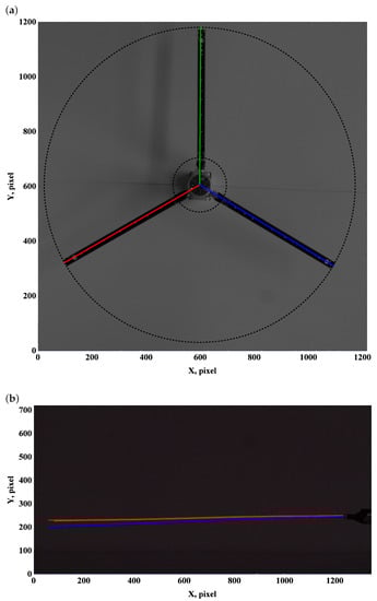 This contribution is focused on experiments with a constant angular velocity. During the tests, two parameters have been changed: the angular velocity and the preset angle of the blade. The authors considered four different setting angles: , , , and . For every angle, three different angular velocities of the rotor have been set: 50 rpm, 100 rpm, and 150 rpm. Two high-speed cameras have been used, as well as signals from strain gauges in the measurement setup; see Figure 2. One camera was hung on the top of the rotor to capture the view of the whole stand, while the second camera was placed perpendicularly to the rotation axis. In order to cover the whole motion range, the top camera was placed m away from the rotation plane.