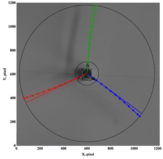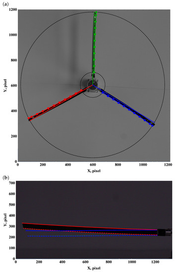 The videos obtained from the two high-speed cameras were post-processed in Mathematica commercial software. Figure 3, Figure 4, Figure 5, Figure 6, Figure 7, Figure 8, Figure 9, Figure 10, Figure 11 and Figure 12 are elaborated on the basis of single pixels for a selected freeze-frame at the highest deformations of the beam; we then placed them in a planar coordinate system and then construction lines and points were plotted on them. The results of this painstaking manual work are grouped according to the preset angle (, , , and ) in Section 3.1, Section 3.2, Section 3.3 and Section 3.4, and ordered from the lowest to the highest angular speed (50, 100, 150 rpm). Note that the greater the preset angle of the beam, the greater the aerodynamic drag. Therefore, measurements for the preset angle and angular velocity greater than 100 rpm, as well as the preset angle and angular velocity greater than 45 rpm, are above the drive’s operating range.