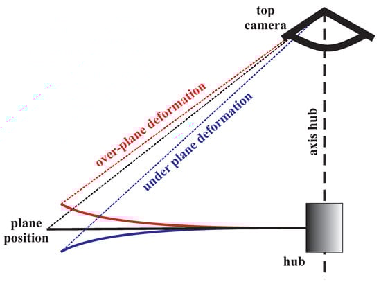Side view of the top camera axially aligned with rotating hub: the effect of beam deformation outside the rotor plane on camera observation.