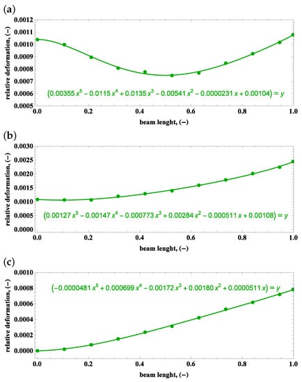 Sets of points in the plane of the beam length vs. the relative deformation are approximated by polynomials, which is the main purpose of the camera measurements gathered in Figure 13, Figure 14 and Figure 15.