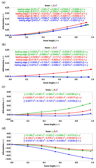 Side view—beam deformations and their description by polynomials: (a) preset angle and angular speed 100 rpm, (b) preset angle and angular speed 50 rpm, (c) preset angle and angular speed 100 rpm, (d) preset angle and angular speed 50 rpm.