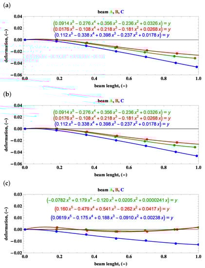 Beam deformations and their description by polynomials: (a) preset angle and angular speed 50 rpm, (b) preset angle and angular speed 100 rpm, (c) preset angle and angular speed 50 rpm.