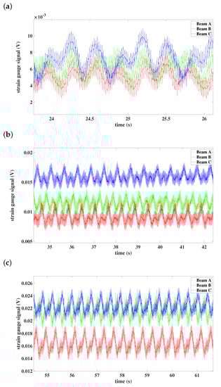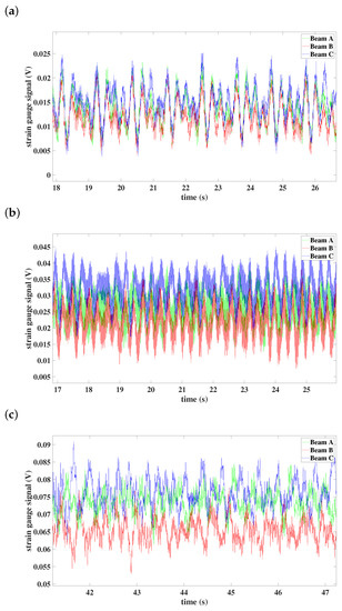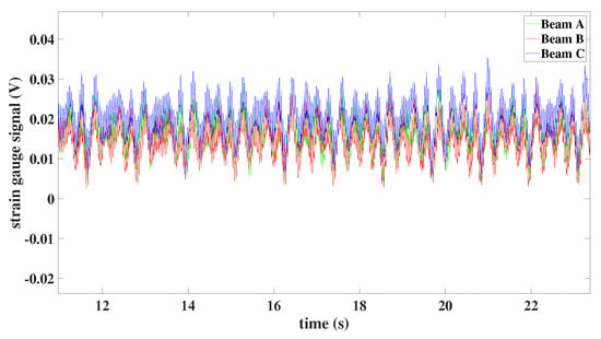 In this section, time series from the strain gauges are analyzed in detail. On each beam near to the fixed end, the strain gauge is embedded, the signal from which is sent wirelessly to the software; see Figure 2. In our study, we focused on the longitudinal direction of the beams. The results are grouped according to the preset angle (, , , and ).