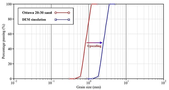 Sand particles in the samples followed the size distribution in Figure 1, which was scaled up from that of Ottawa 20–30 sand by 3.0 times in order to make the computational cost affordable [35]. As shown in Table 1, the particle density was set as 2650 kg/m3, the same as that of Ottawa 20–30 sand. A linear contact model was assigned between the sand particles for its simplicity, following the practice in Guo and Zhao [36]. Therefore, the interparticle contact stiffness was linearized using Equation (1), which was based on the Hertz–Mindlin theory and derived by Li et al. [26].