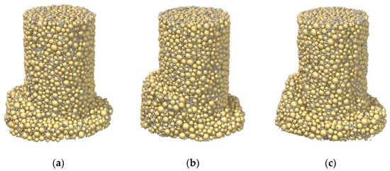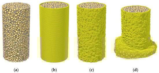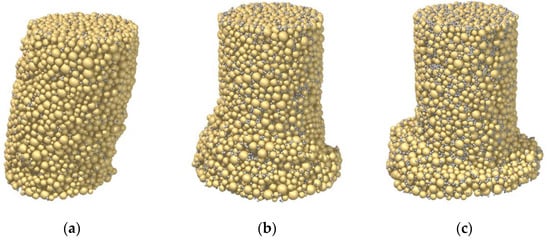 After sample preparation in the mold, the rigid lateral wall was removed and replaced by the particle-based membrane, as shown in Figure 2b. To eliminate the leakage of soil particles from the pores of the membrane, the membrane particles were arranged with a hexagon-like pattern, i.e., having each one connected with six neighbors. Details of the establishment process were previously described by Li et al. [45]. Note that the top and bottom ends of the membrane were allowed to deform, which is different to the laboratory setting where these two ends are fastened by O-rings. The purpose was again to reduce the constraint from the boundary condition. Thereafter, with the establishment of the membrane boundary, all samples were consolidated under the confining pressure of 50 kPa, as exemplified in Figure 2c. The confining pressure acting from the rigid wall boundary was realized using the servo-control algorithm proposed by Thornton [51], while that from the membrane boundary was applied using the algorithm proposed by Li et al. [26]. Note that, at the end of consolidation, the void ratio of the sample was measured, taken as the initial value in Table 1.