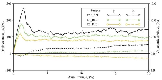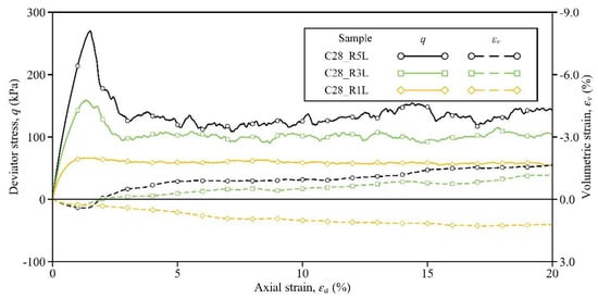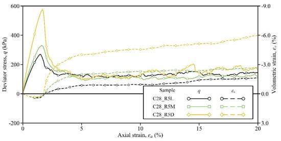 In line with the strain-softening behavior, all samples exhibited dilative behavior (see the dashed lines). The consistency among these samples implies that once sufficient cement is used and well cured, e.g., using the curing time of 28 days and the cement–sand ratio of 5%, an improvement in the soil, whether loose or dense, can be guaranteed using Portland cement. In contrast, when using an insufficient curing time, e.g., Sample C3_R5L, or insufficient among of cement, e.g., Sample C28_R1L, contractive and strain-hardening behavior may occur. Nevertheless, as the initial void ratio decreased, the volumetric dilation could be further enhanced, and the ultimate values for Samples C28_R5L, C28_R5M, and C28_R5D were −1.65%, −2.70%, and −5.96%, respectively.
