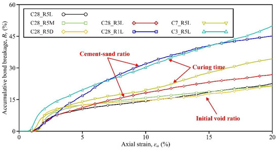 Figure 9 plots the evolutions of Br for the seven samples, allowing the influences of different sampling factors to be recognized. Firstly, with the increase in curing time/bond strength, bond breakage may emerge at a greater axial strain and Br can be lowered throughout the shearing process. To be specific, at the axial strain of 5%, Br in Sample C3_R5L reached 19.6% (see the cyan line), while the values in Sample C7_R5L and C28_R5L were reduced to 13.9% and 10.5%, respectively (see the earth-yellow and black lines). Secondly, similar to the curing time, by increasing the cement-sand ratio, Br could also be lowered. Here, at the beginning of the test, the evolution patterns among Samples C28_R1L, C28_R3L, and C28_R5L were similar. However, after the axial strain of 3%, the difference grew. At the end of shearing, Br developed to 44.3%, 26.2%, and 21.5% for these three samples, respectively (see the blue, red, and black lines). Lastly, the evolution of Br appeared to be insensitive to the initial void ratio, since the responses of Samples C28_R5L, C28_R5M, and C28_R5D were similar to each other.