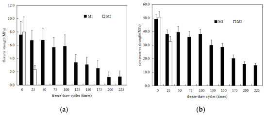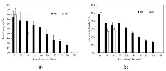 - The P.O mortar specimen (M2) completely lost its strength after 75 freeze–thaw cycles in water and 50 freeze–thaw cycles in 5% Na2SO4 solution. The MKPC mortar specimen (M1) with the same strength grade was frozen and thawed in water 75 times and 5% Na2SO4 solution 100 times, where the residual strength rate was higher than 75%. After 50 freeze–thaw cycles in water and 5% Na2SO4 solution, the mass loss of the M2 specimens exceeded the 5% damage standard, while the mass loss of M1 was much lower than 5%. These results show that the water freeze–thaw resistance and sulfate solution freeze–thaw resistance of MKPC mortar specimens is much higher than that of Portland cement mortar specimens, and the salt freeze–thaw resistance is better than the water freeze–thaw resistance.