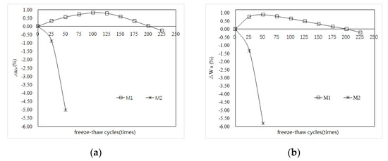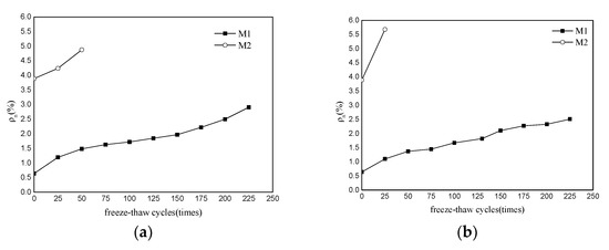 Figure 4 shows the appearance of the M1 and M2 specimens subjected to freeze–thaw cycle tests in water and 5% Na2SO4 solution until the end of the test. After 225 water freeze–thaw cycles, the epidermis of the M1 specimen was basically peeled off, the exposed surface capillary was large, the specimen had a small number of cracks, and the edges and corners had a small number of defects; after 50 water freeze–thaw cycles, the edges and corners of the M2 specimen were severely damaged. The specimen broke automatically when it was taken out, and its internal structure and crispness can be seen from the exposed surface. The shape of M1 after 225 cycles of sulfate freezing and thawing was basically intact, and the degree of skin peeling was less than that of M1 frozen and thawed by water. After 25 cycles of sulfate freezing and thawing, the edges and corners of the M2 specimen were severely damaged, the epidermis was completely peeled off, the exposed surface had large pores, and the structure was loose.