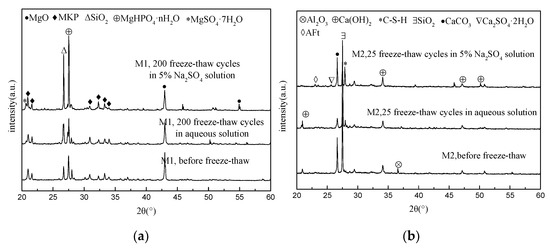 Figure 6 shows the XRD patterns obtained from the analysis of the hardened body powder of the broken M1 and M2 specimens before and after 200 (25) freeze–thaw cycles in water and a 5% Na2SO4 solution. Figure 6a shows the XRD analysis results for M1. The types and positions of the main diffraction peaks in the M1 samples subjected to natural curing, 200 water freeze–thaw cycles, and 200 sulfate freeze–thaw cycles are approximately the same, with characteristic peaks of unreacted MgO and sacrificial peaks of the hydration product MgKPO4·6H2O (MKP), as well as the main characteristic peaks of MgHPO4·nH2O and SiO2. The characteristic peaks of MgSO4·7H2O could also be seen for the M1 sample after 200 sulfate freeze–thaw cycles, indicating that sulfates had penetrated the matrix and reacted with Mg2+. Figure 6b shows the XRD analysis result of M2. In the natural conservation M2 sample, characteristic peaks of CSH, Ca(OH)2, CaCO3, Al2O3, and SiO2 mainly exist. The characteristic peaks of AFt and CaSO4·2H2O can also be seen, indicating that the sulfate radicals in the solution are involved in the chemical reaction.