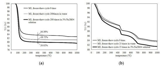 TG of M1 and M2 samples after different numbers of cycles of freeze–thaw in water and 5% Na2SO4. (a) M1; (b) M2.