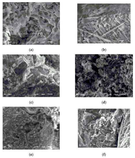 SEM images of MKPC mortar samples and P.O mortar samples. (a) M1, before freeze–thaw; (b) M1, after 200 freeze–thaw cycles in water solution; (c) M1, after 200 freeze–thaw cycles in 5% Na2SO4 solution; (d) M2, before freeze–thaw cycles; (e) M2, after 50 freeze–thaw cycles in water solution; (f) M2, after 50 freeze–thaw cycles in 5% Na2SO4 solution. A–C are EDS analysis of corresponding areas, see Table 3 for details.