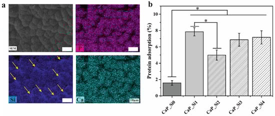 3.2. Element Content and Protein Adsorption