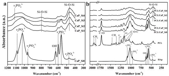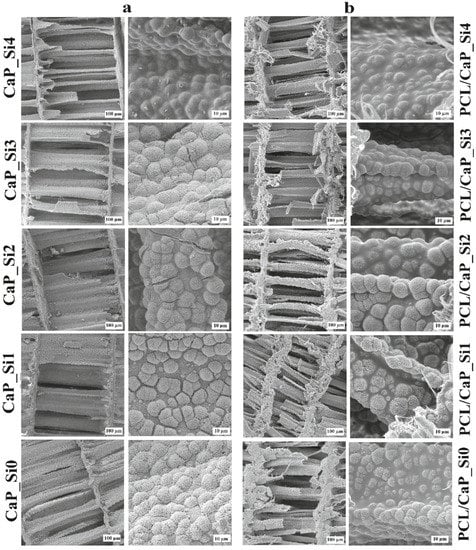 3.4. FTIR Spectra of CaP_Si and PCL/CaP_Si Scaffolds