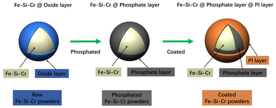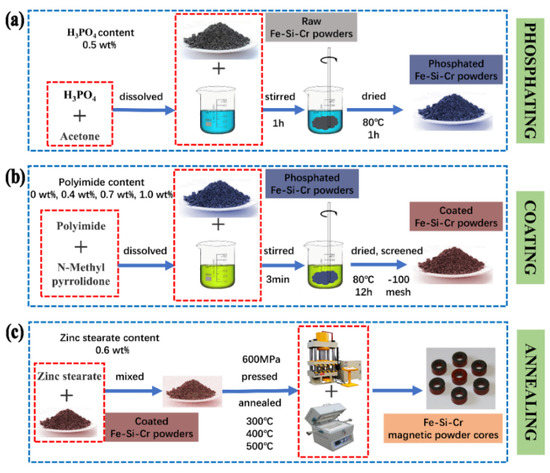 Fe-Si-Cr powders with d50 = 10 μm were prepared by gas atomization, consisting of 3.3 wt% Si, 6.5 wt% Cr, and balance of Fe. The preparation process of Fe-Si-Cr @ phosphate layer @ PI layer core–shell double coating and SMCs is divided into three steps: phosphating, coating, and annealing, as shown in Figure 1. First, Fe-Si-Cr powders were pretreated with phosphate, as shown in Figure 1a. The phosphating procedure was carried out in 50 mL of acetone, mechanical stirring at room temperature for one hour followed by drying at 80 °C for one hour. Secondly, we prepared PI coating, as shown in Figure 1b. The Fe-Si-Cr powders were mixed uniformly with the various PI of 0 wt%, 0.4 wt%, 0.7 wt%, 1.0 wt%, respectively (the PI cannot be dissolved into the water or alcohol solution and can be dissolved with N-Methyl pyrrolidone), and air-dried at 80 °C for 12 h. The dry powders were passed through a screen of −100 mesh. Finally, we prepared and annealed the SMCs; as shown in Figure 1c, the coated Fe-Cr-Si powder was uniformly mixed with zinc stearate lubricant (0.6 wt%). Next, the coated powders were pressed into cores under applied axial stress of 600 MPa with outer diameter of 14 mm, inner diameter of 8 mm, and height of about 3 mm. Lastly, the SMCs were annealed at different temperatures from 300 °C to 500 °C for one hour in argon atmosphere with a pipe furnace.