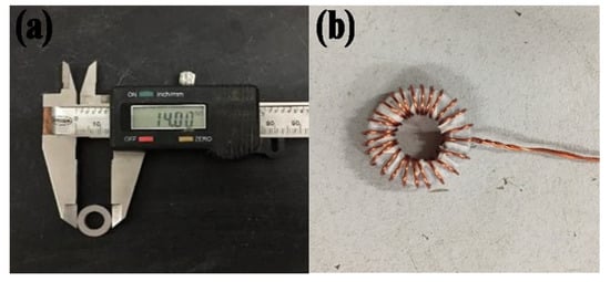 The SMCs sample to be tested: (a) magnetic powder core size and (b) coil winding before magnetic performance test.