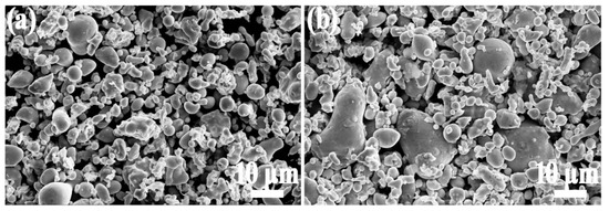 The SEM images of the Fe-Si-Cr raw powder and the phosphated powder are shown in Figure 4. It can be seen from Figure 4a that the distribution of the Fe-Si-Cr raw powder particles is relatively dispersed, and most of the particles are spherical or nearly spherical (spindle shape). This is because the cooling rate of the gas atomization process is slower than that of the water atomization process, and it is easy to obtain a spherical powder. At the same time, for the surface oxide layer of powder particles, the gas-atomization process is much smaller than the water-atomization process. It can be seen from Figure 4b that the surface of the Fe-Si-Cr powder particles after phosphating is smooth, which indicates that the phosphate layer is evenly distributed on the surface of the powder. After the phosphating treatment, the phosphated substance—the reaction product of phosphoric acid, iron, and chromium—cannot be observed intuitively and is further characterized by other methods in a follow-up.