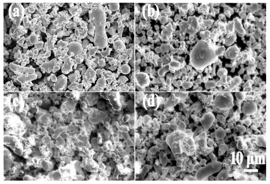 Figure 6 is a microscopic image of Fe-Si-Cr powder coated with different content of PI. In Figure 6a, the Fe-Si-Cr powder is uncoated after phosphating. The powder is relatively dispersed and has an average particle size of 10 μm. In Figure 6b,c, the Fe-Si-Cr powder coated with PI is a mostly irregular, spherical powder. Meanwhile, there is a reunion as a result of the bonding effect of PI.