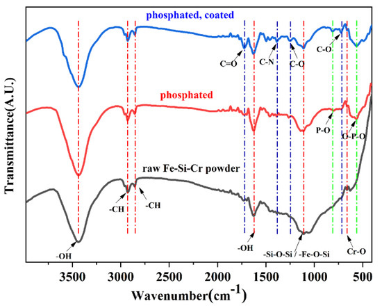 FTIR spectrum of uncoated and coated Fe-Si-Cr powder (from bottom to top is the raw powder, phosphated powder, and phosphate-coated powder.