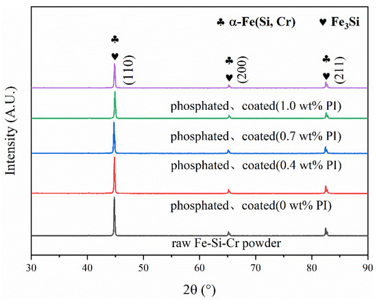 Figure 8 is the XRD pattern of Fe-Si-Cr powders with different PI coating amounts. Three sharp characteristic peaks (110), (200), and (211) are detected, which are consistent with the peaks of the α-Fe and Fe3Si [40,41]. The Si and Cr atoms are solid-dissolved in the crystal lattice of α-Fe, and a solid solution of bcc -α-Fe (Si, Cr) is formed. It can be seen from the figure that the characteristic peak intensity after phosphating is significantly lower than the characteristic peak intensity before phosphating. This is due to the reaction of iron and phosphoric acid to form a phosphate layer, which reduces the characteristic peak intensity of α-Fe [42], and FTIR spectroscopy analysis also confirmed the existence of the phosphate layer. As the amount of PI coating increases from 0 to 1.0 wt%, the characteristic peak intensity also shows a downward trend. This is because the thickening of the PI layer weakens the X-ray absorption of the Fe-Si-Cr matrix. However, due to the thinner phosphate layer and PI layer, the XRD failed to detect the phosphide and PI phases.