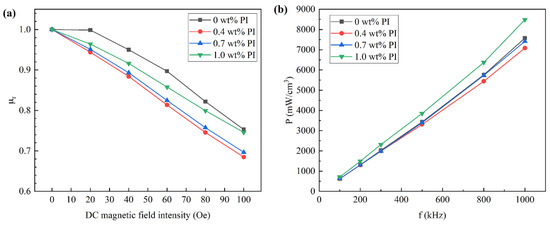 The magnetic properties of SMCs can be characterized by relative permeability and DC bias capability. DC bias refers to the superposition of an alternating current when an alternating magnetic field and DC magnetic field are simultaneously applied to the magnetic core. Figure 9a shows the DC bias capacity curve of Fe-Si-Cr SMCs coated with different contents of PI. It can be seen from the figure that the DC bias capacity of SMCs without PI is the best. When the applied magnetic field strength is 100 Oe, the relative permeability reaches 75%. Compared with the sample without PI, PI reduces the relative permeability of SMCs; however, when the magnetic field strength is 100 Oe and the PI content is 0.4 wt%, the relative permeability is >68%, indicating that its DC bias ability is not poor. In the range of 0~1.0 wt%, the relative permeability increases with the increase in PI content. This is because, in the applied DC magnetic field, SMCs are magnetized, the pressing density of SMCs without PI is low, and the air gap hinders the rotation and displacement of the magnetic domain, which makes it difficult for SMCs to be magnetized to saturation. However, the compaction density of SMCs with PI is relatively high, the air gap is small, and the displacement and rotation of the magnetic domain are relatively small, so it is easier to be magnetized to saturation. However, the addition of non-magnetic PI resin reduces the proportion of magnetic substances in SMCs. At this time, the resin hinders the rotation and displacement of magnetic domains, such as the gap between particles. Therefore, the relative permeability decreases compared with that without PI resin.