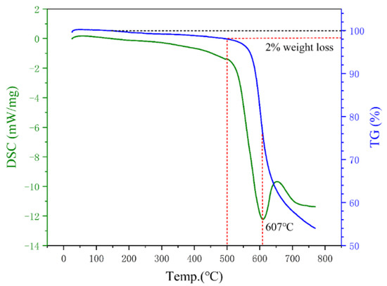 From the point of view of eliminating residual stress, the higher the annealing temperature, the better the effect. However, the selection of the annealing temperature should consider the influence of the passivation layer and coated layer. Phosphating treatment will form a passivation layer on the surface of the powder, and the phosphating layer will crystallize with iron at 500 °C [43]. In addition, the final annealing temperature should be determined in combination with the heat resistance of the PI coating. As shown in Figure 10, according to the DSC curve, PI has an endothermic peak near 607 °C, which is the thermal decomposition temperature of PI. According to the TG curve, the 2% thermal weight loss temperature is as high as 500 °C (mainly due to the evaporation of adsorbed water in PI powder), and the maximum heat-resistant temperature of PI can reach 600 °C. Therefore, the final annealing temperature range is determined as 300~500 °C.