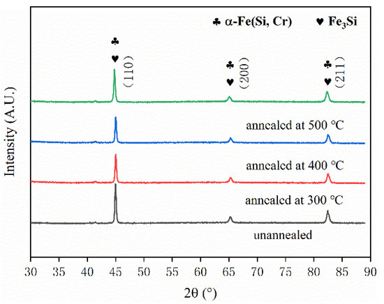 Figure 11 is the XRD pattern of Fe-Si-Cr SMCs with different annealing temperatures. Similar to Fe-Si-Cr powder, three sharp characteristic peaks (110), (200), and (211) are detected, and the phase composition is mainly α-Fe (Si, Cr) solid solution and Fe3Si. It can be seen that annealing only eliminates the internal stress of SMCs without changing their phase composition.
