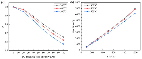 The pressing process will reduce the air gap and produce residual stress in the SMCs before the annealing process. Due to the reduction in non-magnetic materials and the increase in effective permeability, the DC bias ability becomes worse. The trend of DC bias capacity with heat treatment is shown in Figure 12a; the relative permeability of the SMCs annealed at 300 °C is the highest, reaching 69% at 100 Oe. The relative permeability of cores reduced gradually with the decrease in the annealing temperature from 300 °C to 500 °C. This is because the higher the annealing temperature, the lower the domain wall resistance, and the corresponding magnetic core is easily magnetized to saturation. However, under a 100 Oe magnetic field intensity, the magnetic permeability of the SMCs annealed at 500 °C reaches 57%, which also does not show a poor DC bias.