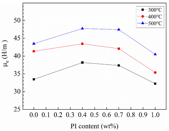Figure 13 shows the effective permeability of Fe-Si-Cr SMCs at different PI contents and different annealing temperatures. It can be seen that all the samples show the same trend; with the increase in PI content, the effective permeability increases first and then decreases at the same temperature. The phenomenon can be ascribed that the increase in PI leads to the high compaction density of the powder, and thereby the air gap decreases and the effective permeability increases, which can be confirmed in Table 1. The density of core coated at 0.4 wt% PI and annealed at 500 °C reached 6.213 g/cm3. However, PI is a non-magnetic substance, and the increase in PI causes a decrease in magnetic material and a decrease in effective permeability. The best response was obtained for the sample coated with 0.4 wt% PI. During annealing, the atomic disorder state was changed to an ordered state, the microstructure of Fe-Si-Cr SMCs was optimized well, the air gap was reduced, and the annealed cores were denser, and it can be seen in Table 1 that the density of cores increased with the increase in annealing temperature. Thus, improving the effective permeability of Fe-Si-Cr SMCs, the SMCs show an ideal effect at an annealing temperature of 500 °C. The Fe-Si-Cr SMCs, with 0.4 wt% content of PI and heat treatment temperature at 500 °C, exhibited the best magnetic properties: μe = 47 H/m, p = 6222 mW/cm3.