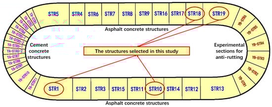 As the first full-scale pavement testing loop in China, RIOHTrack was built in Tongzhou, Beijing. There are 19 kinds of asphalt pavement structures and 13 kinds of cement concrete pavement structures in RIOHTrack, as is shown in Figure 1: