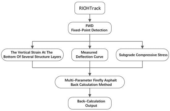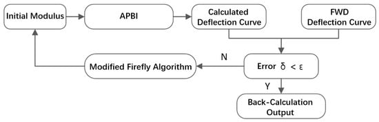 Popular asphalt pavement modulus back calculation methods used now are based only on the FWD deflection curve. Considering the unavoidable system errors in FWD deflection curve measurement, which could lead to inaccuracy, based on the FABCM introduced above, a multi-parameter firefly back calculation method with the vertical strain at the bottom of one or several of the structure layers, or with subgrade compressive stress as input parameters, was designed in this study. The process is as shown in Figure 3: