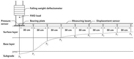Asphalt pavement structure systems of three and four layers were selected to verify the stability and accuracy of FABCM, and the theoretical deflection curves of them were calculated with BISAR 3.0. The structure of the three layers consists of asphalt concrete surface, cement treated macadam base and soil subgrade, and the structure of the four layers shares the same materials, but with a cement treated soil subbase between the base and subgrade. The thicknesses and moduli of those structure layers are as shown in Table 3. After that, those calculated deflection curves were brought into FABCM as input parameters to conduct modulus back calculation. The applied load is a circular uniform load with a concentration of 0.707 MPa (the load concentration of standard axle load BZZ-100 in China) and a radius of 15 cm (usually used bearing plate size for FWD [42]). The distances between the deflection measuring points and load geometric center are: P0: 0 cm, P1: 30 cm, P2: 60 cm, P3: 90 cm, P4: 120 cm, P5: 150 cm, P6: 180 cm, P7: 210 cm, P8: 240 cm (as is shown in Figure 4). Poisson’s ratios are determined by 0.25 for surface material, 0.25 for base material, 0.35 for subbase material and 0.4 for subgrade material. The calculated theoretical deflection curves are as shown in Table 4.