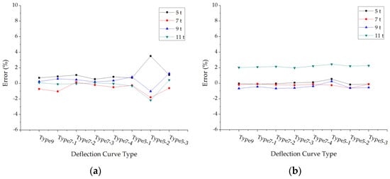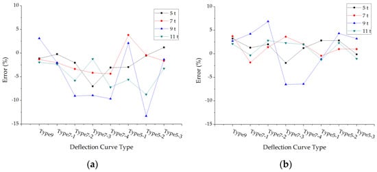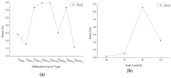 The average errors of back calculated subgrade modulus: (a) The average errors under different deflection curve types; (b) The average errors under different axle loads.
