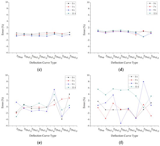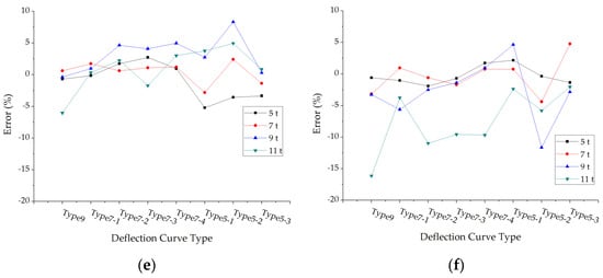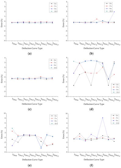 The errors of back calculated subgrade modulus under different deflection curve types: (a) Structure 1; (b) Structure 2; (c) Structure 3; (d) Structure 4; (e) Structure 5; (f) Structure 6.