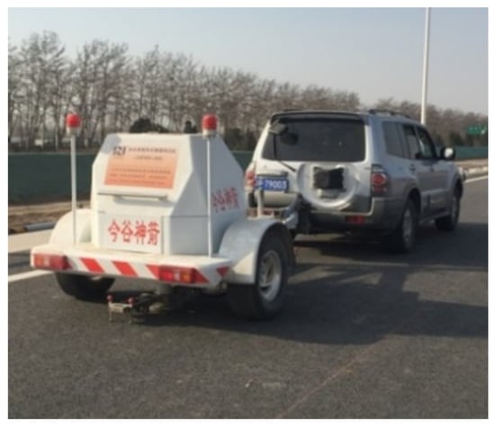 According to the error analysis in Section 3.2, it could be known that there is no clear connection between modulus back calculation errors and deflection curve types, which indicates that the modulus back calculation accuracy is hardly influenced by the type of deflection curve. Based on this conclusion, considering that the deflection curve shape cannot be accurately described when the number of measuring points is too small, which could lead to the inaccuracy of modulus back calculation, the deflection curve type 9 was used in FWD tests due to its abundant measuring points. The FWD equipment used in this study is shown in Figure 14. The concentrated loads in FWD tests are 5 t, 7 t, 9 t and 11 t.