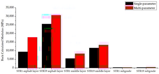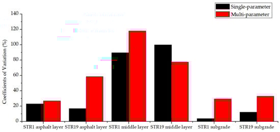 For the same structure layer, the back calculated modulus of multi-parameter FABCM differs greatly from that of single-parameter FABCM. The differences vary with different structure layers, and few relations could be found. When it comes to the coefficients of variation, it could be seen from Figure 16 that the variation coefficient of multi-parameter FABCM results is usually larger than that of single-parameter FABCM results for the same structure layer. Both of the two methods provide relatively stable modulus back calculation results for asphalt layers and the subgrade, while the results for the middle layers possess larger variation coefficients.