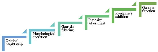 For each material category, we had five color images, resulting in a total of 20 images. The images and their height maps (both are in 782 × 782 pixels) were reproduced from 3D textures (copyright free web site) [20] under the Creative Commons license. They contain various levels of spatial information and colorfulness [21]. The original height maps underwent the processing illustrated in Figure 2 in order to avoid printing artifacts, such as black edges due to high elevation, and to obtain visually nice prints. To reduce black edges, the height maps were processed with a Gaussian filter with a standard deviation of four, and to ensure visually nice prints, a morphological operation was applied to some images. An intensity adjustment was done to reach the intended maximum elevation. The roughness was added by direct binary search halftone blue noise with a zero mean generated by software [22] (input image was a flat grayscale at 128 with zero-mean uniform noise added, and the output image was a halftone noise image). According to Kitanovski and Pedersen [22], the direct binary search algorithm provides high-quality prints. The halftone noise image was further resized with nearest-neighbor interpolation with a resize factor of two and then cropped to the intended size. This was done to get low-frequency noise. We did not use high-frequency noise because the roughness was not visible with it during our initial tests. We applied a gamma function so that the roughness would be reproducible. We used a gamma value of 1/1.4. It was chosen to get visually nice prints via test printing of various gamma values.