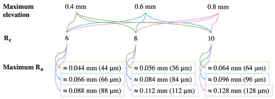 Values of maximum elevation and roughness constants (denoted as ) and calculated maximum roughness amount (denoted as ). The maximum is an approximation of what we would have physically in the prints. Three elevation levels at three roughness constants () gave nine reproductions.