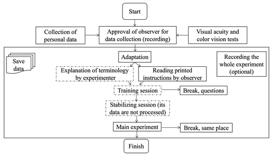 Our proposed framework for subjective quality assessment of 2.5D prints. Parts with dashed dots are optional. We included optional training and stabilizing sessions following the ITU [23] recommendation.
