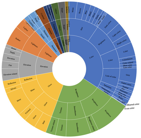 Figure 5 shows the perceptual attributes used for the naturalness assessment of 2.5D prints. We defined attribute groups at three levels. In total, we found twelve level 1 attribute groups (inner circle in Figure 5). They were color, roughness, gloss, elevation, lightness, sharpness, contrast, transparency, shape, softness, artifacts, and others. For example, level 2 attribute groups of sharpness were details and sharpness. Further, level 3 attribute groups of details were visibility and details. The color-related group included chromatic color, uniform color, artificial color, and similar expressions. The texture-related group included descriptions such as even texture, visible texture, rough texture, and similar expressions whereas the roughness-related group included brown spots, noisy rough, granular, and similar expressions. The reflection group included specular reflections, diffuse specular highlights, scattering effect, and similar. The shiny group included shiny, sparkling, glittery, and similar expressions. The elevation-related group included height, altitude, 2.5D, and similar expressions. The lightness-related group included lightness and dynamic range. The others group included descriptions such as substrate, weight, clean, variability, rusty, old, and intuition (some observers ranked based on their intuitions and were not able to explain why they ranked in a specific way). The shape group included shape, size, width, and geometry. Noise and graininess were combined into the artifacts group whereas softness and hardness were combined into the softness group.