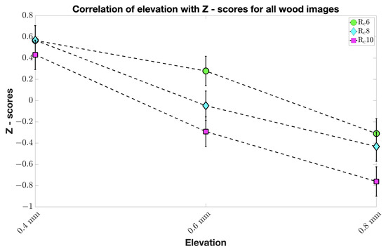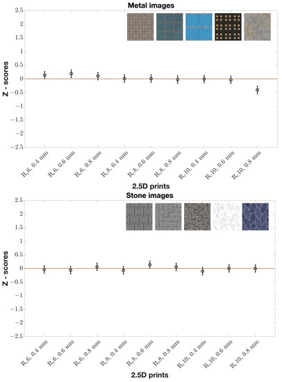 When considering all images in each material category, we observed inverse proportionality between elevation and naturalness for all wood prints according to Z-scores (Figure 7). In other words, the observers found that wood prints should be less elevated to look natural. The same can be said of glass prints (Figure 7). No clear tendency for all stone and all metal prints (Figure 8) was found. We visualize Z-scores in error bar plots. Mean Z-scores are given by circles at the centers of the vertical lines. Confidence Interval (CI) was calculated as shown in Equation (1) [25].