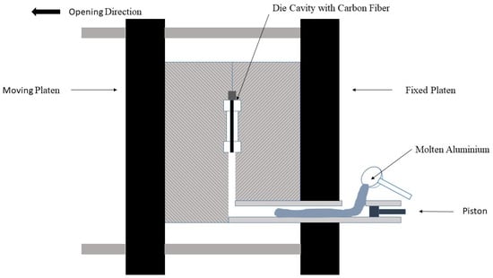 On the other hand, one of the most used casting methods for aluminum pieces is High-Pressure Die Casting (HPDC) [34]. In this technique, molten aluminum is injected into a metallic die, and before the cooling and solidification of the aluminum alloy, high pressure is suddenly applied by a piston driven by compressed nitrogen. The alloy solidifies quickly due to the heat evacuated by the metal mold, and a fine microstructure is obtained [35]. In addition, the applied pressure reduces the size and number of the defects, which in most cases are trapped gas bubbles from the lubricant used for the demolding of the piece [36]. This process allows obtaining aluminum pieces for very different applications with a very competitive cost and with high production rates [37]. Therefore, HPDC seems to be optimal for the infiltration of carbon fibers with no need for preforms since the molten aluminum and the reinforcement adapt to the mold. However, it has not been used in composite manufacturing until now because of the difficulties of placing the fibers, the need for highly complex machinery, and the low reinforcement rates that there seems to be possibly obtained.