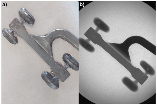 The samples were manufactured following the procedure indicated in the experimental section. Figure 2a shows one of the manufactured samples with the dog bone shape and with the throughs for the excess aluminum and the aluminum inlet. The samples did not show external defects, and no carbon fibers were present on the surface. This indicates that the carbon fibers were embedded in the aluminum alloy and that the fabric was not pushed away by the aluminum injected.
