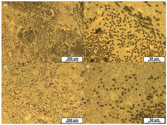 Optical micrographs of the AMCs: (a,b) samples manufactured with woven, and (c,d) samples manufactured with unidirectional fiber.